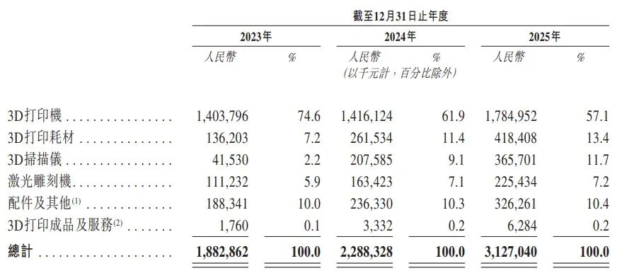 3D打印机、3D打印耗材、3D扫描仪、激光雕刻机、配件及其他,以及通过创想云(公司专注于3D打印内容的全球在线社区)提供的各类服务。此外,公司于2025年8月推出Nexbie,一个专注于3D创意成品的海外电商平台。